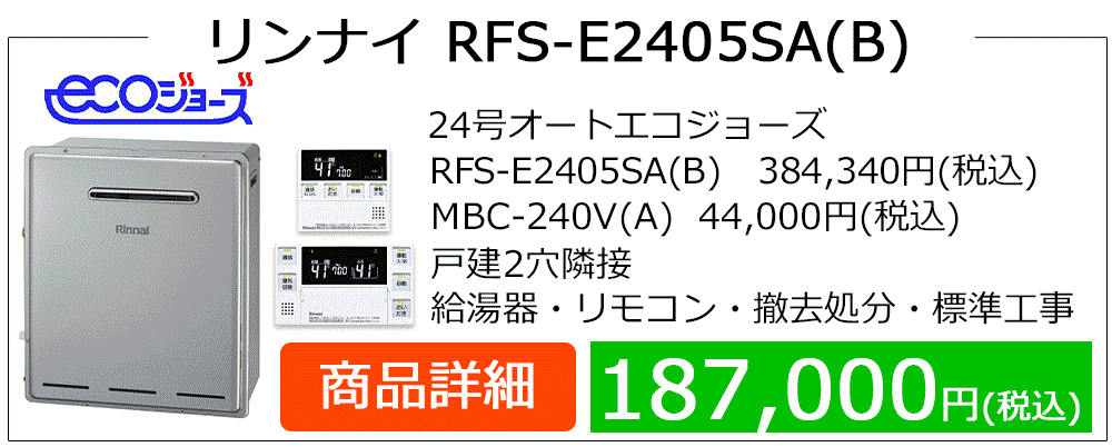 RUF-E**06(S)AW(A)・RUF-E**05(S)AG(B)・RFS-E**05(S)A(B)シリーズはガス代節約型のエコジョーズ給湯器です。エコジョーズでは、今まで使わずに捨てられていた排気熱を有効に使用して、あらかじめ給湯器の入水を温めます。そのため従来型より少ないガス使用量で、効率よくお湯が沸かせます。エコジョーズからの取替はもちろん、従来型からの取替も大多数のお客様がエコジョーズ給湯器をお求めになられます。