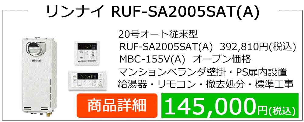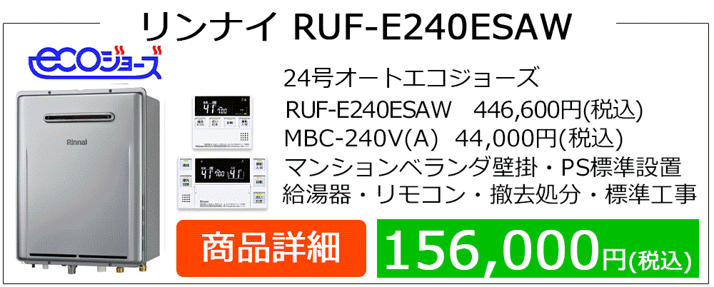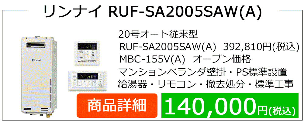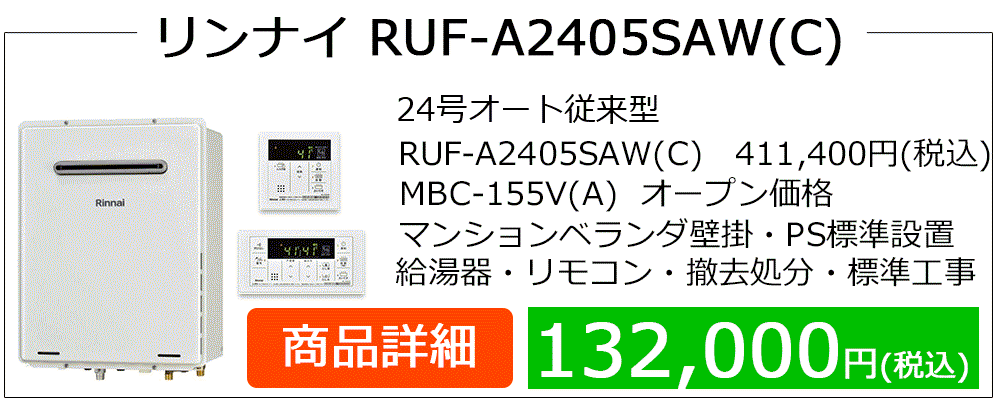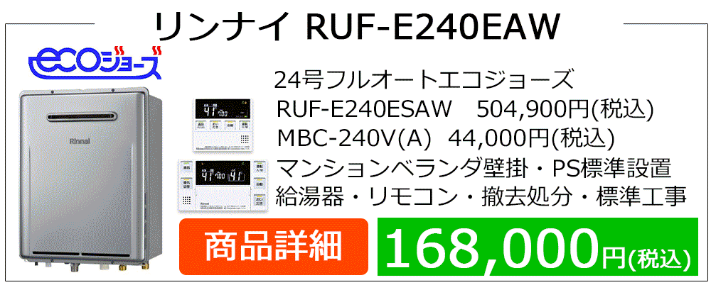 RUF-A**05(S)AWシリーズはマンション廊下PS設置によく見られるRUF-A**00(S)AWシリーズ等の後継機種です、PS設置はドレン排水設備の無い場合が多くエコジョーズ給湯器に取替の場合、浴槽エプロン内に3方弁ユニット設置やドレンアップ配管工事等、専用給湯器・付帯工事が発生して費用が高額になります。エコジョーズはガス代が安くなりますが、この場合は費用対効果が見込めません。