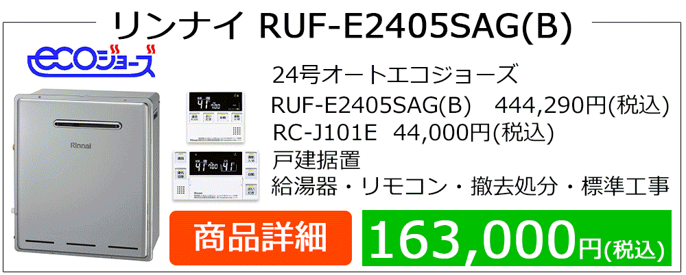 RUF-E**06(S)AW(A)・RUF-E**05(S)AG(B)・RFS-E**05(S)A(B)シリーズはガス代節約型のエコジョーズ給湯器です。エコジョーズでは、今まで使わずに捨てられていた排気熱を有効に使用して、あらかじめ給湯器の入水を温めます。そのため従来型より少ないガス使用量で、効率よくお湯が沸かせます。エコジョーズからの取替はもちろん、従来型からの取替も大多数のお客様がエコジョーズ給湯器をお求めになられます。